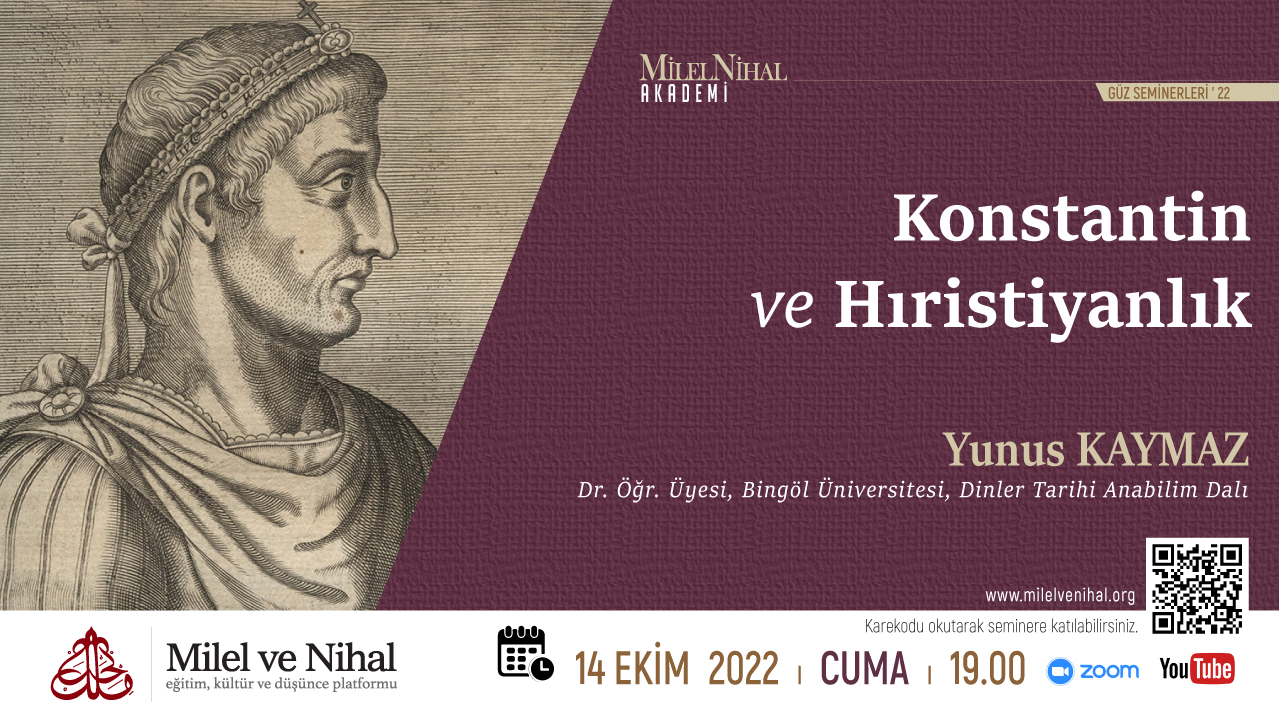 MilelNihal Akademi Güz Seminerlerimizde bu hafta (14 Ekim 2022 - Cuma) Bingöl Üniversitesi İslami İlimler Fakültesi Dinler Tarihi Anabilim Dalı öğretim üyesi Dr. Öğr. Üyesi Yunus Kaymaz hocamızı ağırlıyoruz. Hocamız "Konstantin ve Hıristiyanlık" başlıklı konuyu anlatacak.